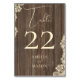 Wood Lace Wedding Rustic Table Number Card. Embrace a charming rustic aesthetic for your special event with this beautifully designed table number card. Featuring a warm, weathered wood background accented by delicate ivory lace in the corners, this card exudes a vintage and elegant feel. The prominent table number is displayed in a sophisticated cream font, ensuring easy visibility for your guests. Below the number, the couple's names are elegantly printed, adding a personal touch to your wedding or party decor. This table number card is perfect for creating an inviting and memorable atmosphere for your shabby chic, garden, or rustic wedding.