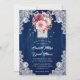 Blåblått och bröllopsinbjudan till marinen för marinen med en bukett av och dahlier och grön i en mason burk mot en blå lada-bakgrund med vit blommigt snöre och sträng ljus. Utformning av perfekt för att bjuda in gästerna till din marinblå och , roliga bröllopsfest.