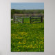 För in några av land i med Grind Poster Skriv ut på trägården. Det här charmerande anpassningsbarna ranch-temat poster ett scenfotografi av gården grind med viltlevande trägård där gult dandelion växer i en grönt i förgrunden på en blå himmel-dag på landsbygden Midwest Illinois.