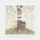 Babyduschservetter med illustration av träd med grönt löv och utsatta rötter. En räv och en räv som sitter på båda sidor om strupen och en uggla sitter på banderollen som är inlindad runt strunk och säger: "Det är en pojke!" Bunting är vitt och blått.