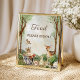 A charming woodland food table poster featuring soft watercolor trees and sweet forest animals in a warm storybook setting. The deer, squirrel, raccoon, bunny, hedgehog, and bird create a gentle rustic look that is perfect for a nature-inspired baby shower celebration. Soft greenery and earthy tones make this design a beautiful choice for a gender-neutral event and coordinated woodland party decor. A lovely poster for styling your buffet table and inviting guests to enjoy the food.