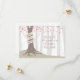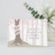 Ett utomhus bröllop spara datum med en illustration av ett träd i skogen med rosa löv och exponerade rötter med en banner inlindad runt strupen för ett pars namn.