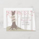 Ett utomhus bröllop spara datum med en illustration av ett träd i skogen med rosa löv och exponerade rötter med en banner inlindad runt strupen för ett pars namn.