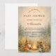 A heart-melting woodland design featuring a sweet gathering of forest friends beneath a soft storybook canopy. Fox, fawn, bear, raccoon, and bunny sit together in a warm autumn meadow framed by gentle trees and vintage parchment tones. The earthy palette and delicate botanical details create a cozy, nostalgic feel—perfect for a nature-inspired celebration. Fully customizable to make it uniquely yours.