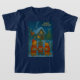 Woodland Sång Choir T-Shirt. i ett snöskog, en hund, en tvättbjörn och katt i mysigt ullkläder sjungan glatt sång. Nearby, en ekorre bär, medan en stenstuvning under mjuk jul snö.