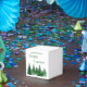 Lycklig-kamper-födelsedag med träd i skogsområden i olika gröntar