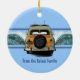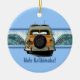 En vintage som är utrustad med ett par långrevar hittar perfektens dubbla. Den illustrerade vågen har en spökbild av en hibiscus pareau-utskrift. Kaliforniens registreringsskylt i vintagen säger Beachin. I jul är vår hälsning "Mele Kalikimaka", men dessa prydnadsföremål ger underbara gåvor varje år och anpassar dem med ert eget budskap! De här mönstren kommer från flera olika färgbanor.