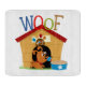 En söt hund med boll och maträtter, ett hund och färgtext som läser WOOF på T-shirts av Hund, hookar, mugg, säckar, kort, klistermärken, nyckelringar, knappar, magneter, torra rasterbrädor, elektroniska caseser och sleever, pappert tallrikar och blöjor och många andra hund design!