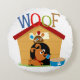 En söt hund med boll och maträtter, ett hund och färgtext som läser WOOF på T-shirts av Hund, hookar, mugg, säckar, kort, klistermärken, nyckelringar, knappar, magneter, torra rasterbrädor, elektroniska caseser och sleever, pappert tallrikar och blöjor och många andra hund design!