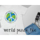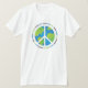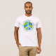 En t-shirt med en unik design: En stiliserad bild av jorden omgiven av en vit fredssymbol, med ord - fred - inskriven på olika språk. Det är ett plagg som symboliserar hopp.