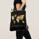 En grafisk världskarta av konstnären/designern Charmaine Paulson på en toteväska. Här används Garamond Bold och färg D0AA6C.