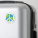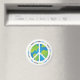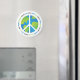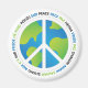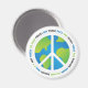 En kylmagnet med en originalutformning av en stiliserad bild av jorden omgiven av ett vitt fredstecken. Ord - fred - omger jorden på olika språk.