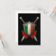 Den här unika designen har Italiens flagga och ett krångligt metall-skydd. Två svärd med kristalldöskallar på munnen korsas bakom skölden. Fyra röd ros med grönt löv visas i grunden för designen som skapar en vacker kontrast till åldrasen och som bärs metall i vapenskölden. Pansaret är dekorerat med utformandet av snurrande mönster och två fempunktsstjärnor högst upp på konstruktionen. Stora repor och metalliskt färg ge i mönster en åldras och utslitna utseende. Detta patriotiska medeltida mönster är ett underbart sätt att visa upp ert italienska pride.