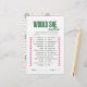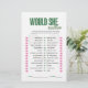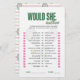 Add fun and laughter to the celebration with this Would She Rather bridal shower game card, designed as a full-page paper game sheet. Guests will guess which option the bride-to-be would choose by placing a tick next to their answers. Featuring a charming tennis-inspired design, this game is perfect for tennis lovers, sporty brides, country club bridal showers, engagement parties, and wedding showers. The clean, easy-to-read layout makes it simple to play, while the coordinating tennis pattern on the back adds a polished, professional finish. Ideal for modern, elegant, and themed bridal celebrations.
