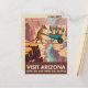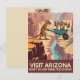 Celebrate classic American travel art with this funny WPA‑style “Visit Arizona” postcard, featuring the state animal — the ringtail — performing a daring tightrope act above the Grand Canyon. One ringtail pushes a wheelbarrow along a suspended rope while two more ringtails ride inside, casually drinking beer.