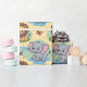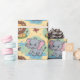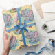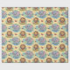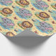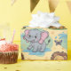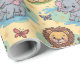 Wrapping paper with cartoon animals, featuring smiling lions and elephants against a pale yellow background. The tone is playful and cheerful.