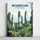 Bring the dramatic stone pillars of Wulingyuan to your wall with this vintage style travel poster canvas. Soft sky tones, misty peaks, and lush green forest layers create a calm, adventurous look that fits modern, boho, and minimalist decor. A great gift for hikers, travelers, and nature lovers.