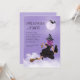 SpellBindande inbjudan från Witch-Thated Halloween fest. Konstruktionen har magisk nattscen i fullt, där en ung häxa och hennes svarta katt ligger över grått nattetid himmel på deras broomstick över ett fluffy vitt moln. Låt Halloween börja magin!