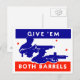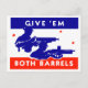 WWII patriotisk utskrift med titeln "Ge em Båda Barrels", som skildrar en amerikansk civilperson i arbete i en krigsfabrik och en amerikansk soldat på fronten linjer.