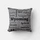 En charmig dekorativ kudde som presenterar det statligt av Wyoming och några av dess städer i svart text med varierande typsnitt och, storleksanpassar på en grå bakgrund på bekläda och svart på baksidaen.
