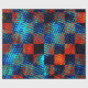 Xadrez com riscos Cruzados, de cor azul escuro e riscos em azul claro e laranja com tons manchados avermelhados, e, border as escuras nos traços que podem causar a klarção de sujo ou manchado.