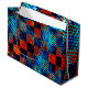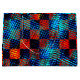 Xadrez com riscos Cruzados, de cor azul escuro e riscos em azul claro e laranja com tons manchados avermelhados, e, border as escuras nos traços que podem causar a klarção de sujo ou manchado.