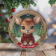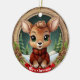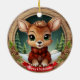 Xmas doe festive holiday wooden rustic pine trees, pinecone design & winter snow Ceramic Ornament! Christmas deer animal character name gift tags for everyone. Whimsical cartoon graphic tree hanging. Fun seasonal, unisex personalizable wood Framed decor. Woodland wonderland wildlife custom decoration. Customizable white text saying "Merry Christmas" on a vibrant red ribbon – easily customize it to make it truly personalized. Accents of pine cones and evergreen branches for a cozy cold season look. The background showcases an enchanting snow landscape complete with a snowy trees topped with stars. Two-sided, ensuring seeing the adornment from every angle – illustration appears on both front and back, so it always looks complete no matter how it spins. Perfect for customized gifting or decorating. Transfer this unique artwork to a variety of other products! Personalize and bring home this delightful keepsake today!