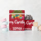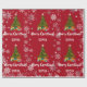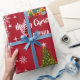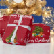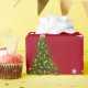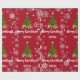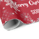 Festive, modern personalized Christmas gift wrap for kids, with a Christmas tree decorated with baubles, lights, and candy canes; the greeting "Merry Christmas" in stylish typography; and a personalized name. On a Xmas red background, with snowflakes.