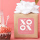 Perfekt för godispåsar och presentförpackning. Denna moderna fyrkantiga Alla hjärtans dag-klistermärke har rundade hörn, stor vit xoxo-stil med vita hjärtan i mitten av o:et på en korallrosa bakgrund.