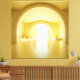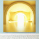 A surreal architectural space in warm yellow tones, featuring layered arches, a bright central opening, and sculptural elements such as a sphere and stepped platform. The clean geometry and soft reflections create a calm, futuristic atmosphere ideal for modern homes, creative studios, offices, and gallery‑like interiors.