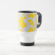 This travel mug features a lively pattern of organic yellow shapes scattered across a clean white background, creating a playful yet contemporary abstract aesthetic.