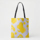 This tote bag features a lively pattern of organic yellow shapes scattered across a clean white background, creating a playful yet contemporary abstract aesthetic.