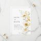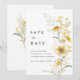 A romantic yellow sunflower and wildflower save the date card featuring soft watercolor florals in an elegant vertical botanical design. Warm golden-yellow blooms and delicate greenery create a natural, garden-inspired look that feels both timeless and modern.