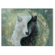 A beautiful semi-abstract design of two wolves in the yin and yang style, one black wolf and one white wolf symbolizing balance and harmony. An aesthetic mandella background with planets in a green and gold theme.