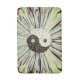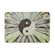 Belysning av färgfläckar av bruna och grönt-strålar ger ett magiskt avgivande från en inspirerande yin-yang-symbol. Hypnotiska groovy vibes.