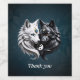 Yin Yang Varger. Bilden har en vit varg och en svart varg, vars huvuden är vända mot varandra i en närbild. Den vita vargen har blått ögon och en guldfärgad dekoration med blått handtag på framsidan, medan den svarta vargen har gult ögon och liknande prydnadsföremål. Vargerna placeras mot en mörk blått bakgrund med en vit Yin Yang-symbol mellan dem.