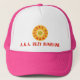 Kid's Truckerkeps rosa med vit framröd och guld cirkel med ljust (med något mörkare ansikte) i mitten och "MAXANNA GLOW A.K.A. SUZY SUNSHINE". Den här designen handlar bara om roligt. Smile och hela världen leker med dig.