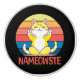 Färgfull illustration med "Name owste"-textdesign och söt Kawaii-katt gör yoga på färglös, rand baksida