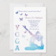 En vacker yogainbjudan med en kvinna i kung duva ställning. Ordet "yoga" är förtryckt och accentuerat med fladdrande fjärilar.