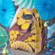 Yolk-Gult för segmenterad hårdkokt äggkokt Gult, komplementskivor för gult och komplementär lila rand. Naturens ägg och lera lera.