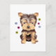 En gullig sitta för valp för Yorkshire Terrier, med sex ljust färgade blommor runt om den. Tre på varje sida. En underbar gåva för alla som älskar en Yorkie.
