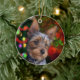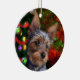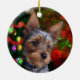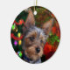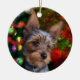 Den unga Yorkshire terrieren eller Yorkie, med helgdagfärger och en julgran i bakgrundshund älskarejulen semestrar prydnaden