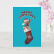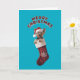 En Yorkie med en julhatt håller sig ur en julstrumpa.