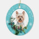 På framsidan av denna Helgdag är ornament en vacker vattenfärg porträtt i en Yorkshire Terrier-hund som pissar ut från en holly och en evergreen bough. Röda bär och gräs-koner dekorerar huggen och gräs sprickor. Bilden placeras på en vit cirkel som ramas in av en retroblå snöflinga mönster. Baksidan av dekorationen har samma bakgrund och cirkel med anpassningsbarnas text i blått på vit bakgrund. Perfekt för alla vars hjärta ägs av en Yorkie!