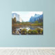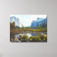 En andlig panoramisk syn på Yosemite Valley, som visar de ikoniska granitklipporna av El Capitan och Halv Dome. Förgrundsinformationen har en lugn vattenslingring genom en ängsskugga, prickad med slätt sten och lush grönt gräs. Himmel är en mjuk blått, med kloka moln som bidrar till atmosfären av fred.