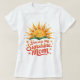 A cheerful illustration featuring a smiling sun with orange and yellow rays and green leaves, representing a mother figure. Below the sun, the text "You are my Sunshine, Mom" is written in orange and red.