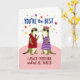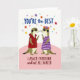 This greeting card shows two cartoon meerkats facing each other on a white background, with a soft pink curved ground under their feet. One meerkat wears a red puffer vest with a little zipper detail, and the other wears a purple striped dress with an orange-and-purple flower headband. They have gentle smiles and bright black eyes, and their raised paws make it look like they’re sharing a friendly moment. Above them, the text “YOU’RE the BEST” appears in friendly blue block letters near the top, surrounded by small stars in pink, orange, purple, yellow, and blue. Below the pair, a second message reads “I ASKED EVERYONE and WE ALL AGREED.” in a maroon, handwritten-style script near the bottom. The overall feel is warm, supportive, and perfect for romance, affection, or close friendship, with a sweet Valentine’s touch ❤️❤️