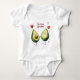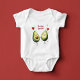Dress your little Valentine in playful charm with this adorable baby bodysuit featuring a cheerful illustration of two smiling cartoon avocados surrounded by bright red hearts. Drawn in a whimsical children’s book–style doodle, the friendly avocados and the playful pun “You guac my world!” make this outfit a fun, festive way to celebrate Valentine’s Day, birthdays, or everyday cuteness.