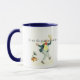 Ett vitt kaffe mugg med mörk blått handtag och fälg och en vismisk bild av "Young at Heart", på baksidan och framsidan. Citatet kommer från Abraham Lincoln.