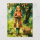 Ett vykort i vattenfärgen stil porträtt för en ung flicka i en röd klänning som står i en fruktodling och håller basket i äpplen. Att omge henne är mogna äpplen på marken och hänger från träd. Scenen framkallar värme, oskuld och naturens skönhet.